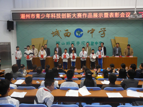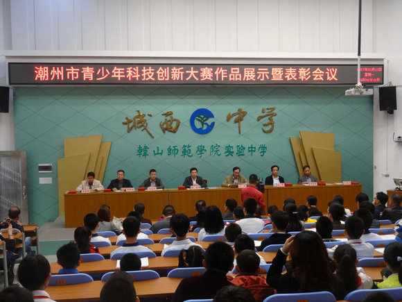 2017年3月13日上午,2016年潮州市青少年科技创新大赛作品展示暨表彰会议在湘桥区城西中学举行。市委常委、统战部部长徐和,市政协副主席、科协主席柯泓,市科协党组书记林峰、市教育局局长陈浩松、市科协副主席郑绍雄、市科技局副局长许敬阳、市教育局副调研员庄建明等领导参加市青少年科技创新大赛作品展示活动并出席表彰会议。获得本次大赛一、二等奖的学生、优秀科技辅导员、优秀组织工作者、优秀组织单位及市直、各区县科协、教育、科技、知识产权、学校的代表200多人参加了作品展示活动及表彰会。