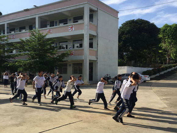 演练中,随着“地震发生”信号警报铃声的响起,学生们在老师的指挥下以最快的速度,迅速躲到课桌旁边,紧急避险。“主震”结束并听到疏散指令后,所有师生弯腰、低头护住头部,按照规定的疏散路线有序撤离到安全地带并快速进行清点人数,整个演练过程严肃、快速、有序。