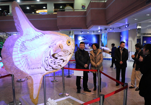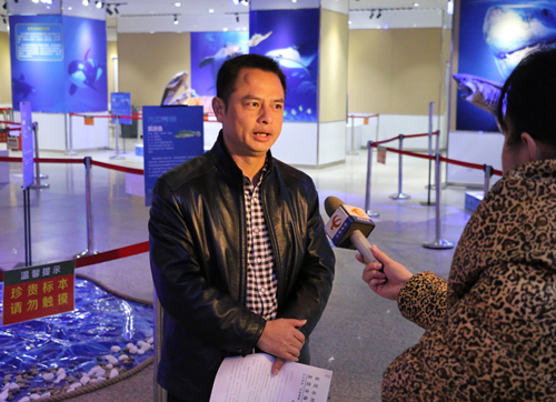 讲解员介绍现场展出的“翻车鱼”标本