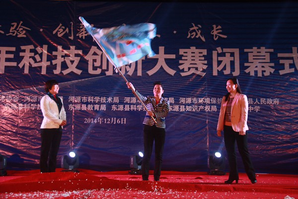 源城区委常委张春慧从东源县委常委陈海青手中接过河源市青少年科技创新大赛的会旗,标志着河源市青少年科技创新大赛将在源城区开启新的征程。