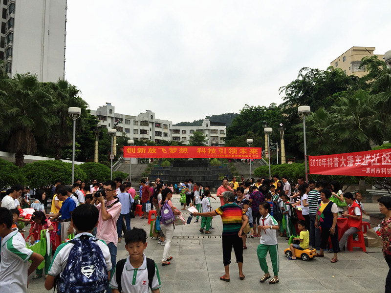 每年9月的第三个公休日为全国科普日,今年是全国科普日活动的第13个年头,为全面贯彻落实《科普法》和《惠东县全民科学素质行动计划纲要实施方案》,9月27日下午,由惠东县科协牵头,科技局、地震局、文明局、环保局、质监局、市场监督管理局、气象局、安监局等12个单位联合开展的“创新放飞梦想,科技引领未来——2016年惠东县全国科普日活动平山街道莲花社区飞鹅岭公园小广场行。