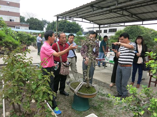 考察组一行来到番禺区沙湾盆景协会的盆景培育及展示现场,兴致勃勃地观赏了会员们自己培育的盆景作品,就盆景选择树桩、嫁接、绑缚、根系造型、种植养护等技术问题以及协会组织建设、运作方式、发展状况、活动开展情况、未来发展方向及规划等相关问题进行了深入交流。双方均表示,这样的活动为大家搭建了一个开阔眼界、互相学习、共同提高的平台,有效推动了盆景培育技术的交流、提升与推广。沙湾盆景协会还热情邀请惠阳区盆景协会参加其在“五一”期间举行的大型盆景展览活动,共同促进盆景事业的健康发展。