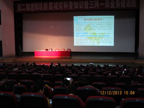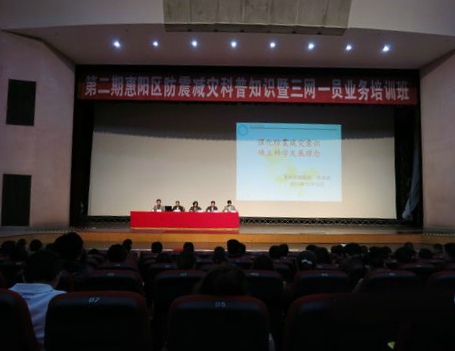 12月12日,惠州市惠阳区在惠阳大剧院举办第二期防震减灾科普知识暨三网一员业务培训班。惠州市地震局副局长傅德文、陈永城,惠阳区副区长朱文转出席培训班。惠阳区抗震救灾领导小组成员,各镇(办)分管领导、安全办主任、防震减灾助理员、灾情速报信息员,各中小学分管领导、安全办主任等400多人参加培训。