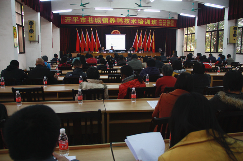 江门开平市科协以培育新型农民、促进现代农业和新农村建设为目标,于12月25日下午,联合市科技局、苍城镇政府和温氏农牧有限公司在苍城镇举办养鸭技术培训班。邀请了温氏公司有关技术员为来自苍城镇以及周边地区的养殖户100多人培训授课,帮助养殖户解决生产中的实际问题,受到农民的热烈欢迎。
