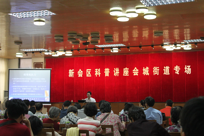 江门市新会区会城街道科协为进一步贯彻党的十八大精神,践行科学发展观,深入开展党的群众路线教育实践活动,于4月23日上午,联合区科技局、区科协在会城街道会堂举办“常见性流行感冒预防”科普讲座,邀请了区疾病预防控制中心副主任聂新强主讲。区科技局、区科协、街道办的分管领导和主管人员、社区和农村科普宣传员以及附近居民近170人参加了讲座。这也拉开了“科技进步活动月”的序幕,接着将在社区和农村举办相关防震减灾、健康知识等多场科普讲座。