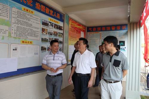 茂名市科协主席朱建雄(前中)出席活动并参观气象科普宣传栏