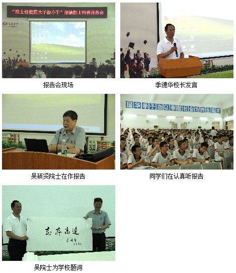 吴硕贤院士是我国建筑界与声学界培养的第一位博士,对建筑环境声学、语言文学、书画、诗词等领域的研究有颇深的造诣。报告会上,吴院士以《代代英才赖少年与成语新解》为主题,声情并茂地为在座350多名师生讲述了他的奋斗成长历程。并引用“眼高手低”、“熟能生巧”等成语,创造性地阐述了这些成语的新义,引导同学们定立远大目标,提高自身素养和能力,培养创新思维。同时,吴院士以自己创作的诗句“理纬文经织锦成”来概括他的治学体会,把治学比喻成编织锦缎,以理科知识为纬线,以文科学养为经线,理与文两不偏废,相互融会,从而达到文理双美的目的。以此进一步鼓励同学们抓好文理科目的学习,平衡发展。