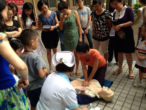 随后他们分成3组在操场,经急救小组成员手把的指导下,进行亲身体验,许多师生学以致用,规范地对人体模型进行心肺复苏急救。同学们非常积极动手参与,每一个动作都做得像模像样,甚至于年仅七八岁的小朋友也在聚精会神地练习,现场气氛十分活跃,取得了很好的效果。虽然师生们经过一天的学习都比较累了但是他们任精神饱满。罗护长表示,不一定要把每一步都做得多么地规范标准,只要能够在紧急情况下挽救生命,那你就成功了。