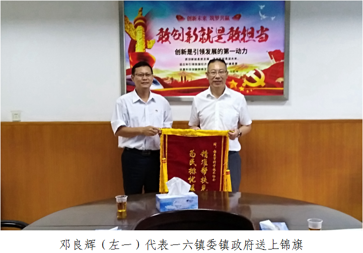 邓良辉表示,自2016年开展精准扶贫工作以来,市科协坚持从实际出发,始终把脱贫攻坚工作放在重要位置,选派思想素质过硬、工作经验丰富的干部驻镇帮扶,从基础设施建设、贫困户危房改造、扶贫车间建设,到发展当地特色产业,全力帮助一六镇“改头换面”。截至2020年12月,一六镇建档立卡贫困户356户760人家庭人均可支配收入全部超出脱贫标准线,实现全员脱贫退出,脱贫退出率达100%。他还表示,一六镇能取得优异的脱贫成效,离不开市科协领导的高度重视,驻镇干部认真负责,成效十分明显,群众认可度、满意度都非常高。随后,邓良辉代表一六镇委镇政府向市科协送上一面写有“精准帮扶见成效,为民排忧暖人心”的锦旗,他还代中共韶关市委农村工作领导小组向市科协转送“2019-2020年韶关市脱贫攻坚突出贡献集体”荣誉证书,并代为向其派出驻镇干部转送“2019-2020年韶关市脱贫攻坚突出贡献个人”荣誉证书。