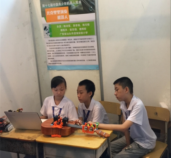 澄海实验小学的杨洁雯、吴冬暄、陈元榕三位同学以广东省机器人创意比赛第一名的成绩代表广东省参加了主题为“我的学习伙伴”的机器人创意赛。本届机器人创意比赛旨在促进学生了解人类学习方式的转变、新技术如何辅助人类学习,提高教育质量,同时尝试创意一个改善或辅助学习的机器人作品。杨洁雯、吴冬暄、陈元榕三位同学的参赛作品是尤克里里演奏机器人,他们在赵世僖、唐辉宏老师的指导下,利用Arduino等开源软硬件进行制作并编写程序,使尤克里里按一定的音乐节奏进行演奏,可以为学习者提供伴奏或学习者练习伴奏、演奏之用。该作品独特的创意以及队员们精彩的答辩获得了评委们的一致好评,在36支代表队中脱颖而出,最终获得了优秀创意奖。这是本次机器人创意赛的最高奖项,是澄海区选手参加全国性机器人竞赛零的突破,也是汕头市选手在该项目成绩的历史性突破。