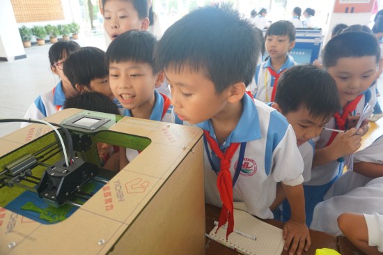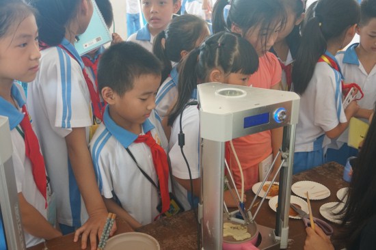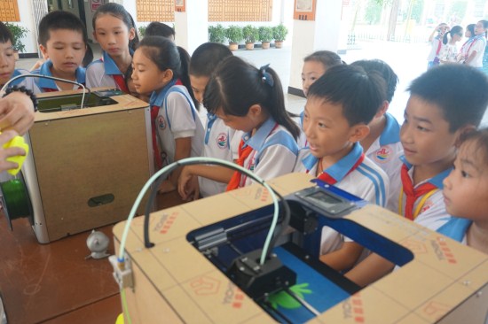 这个一直在“原地转圈”的方格子是什么东西?原来是3D打印机,那可不叫转圈,它正在一丝不苟的工作着呢。同学们围着3D打印机,正仔细的研究着那些可爱的模型是怎么一点点被制作出来的。
