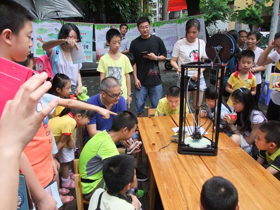 最吸引人注目的还是一群穿着龙湖实验中学校服的学生们。应丹霞小学的邀请,该校机器人队的学生在老师的带领下,将自己设计的机器人拿到现场展示,吸引了里三层、外三层的家长、学生及社区群众的观摩。龙实的学生们兴致勃勃地向感兴趣的孩子介绍演示各式各样的机器人,家长和孩子好奇地观看着,还与机器人进行互动。现场还为家长孩子展示3D打印机工作流程,不少孩子甚至家长还是第一次“零距离”接触3D打印,他们认真地观察3D打印机是如何神奇地地打印出一个个精致的立体小物件来。