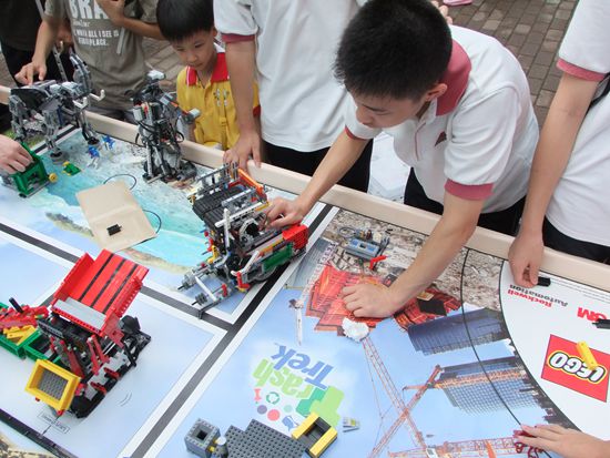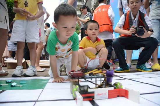 那边,丹霞小学的小学生们正为自己的小机器人进行编程调试,下地测试失败就再调试,这种不气馁,不放弃的精神感染了围观的小朋友,他们屏气凝神,全神贯注,暗暗地为大哥哥们加油打气。