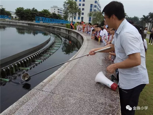 为提高学生们的科学素养、增强学生们的环保意识,2017年5月13日金珠小学组织学生前往汕头市龙珠水质净化厂进行科学社会实践活动。净化厂的工作人员再带领孩子们亲临污水处理现场进行实地参观,当来到沉砂池、生化池的时候,一阵阵恶臭让孩子们赶紧捂住口鼻。“真不知在这种恶劣环境下工作人员是怎样坚持工作的?”一个女生说。另一个男孩子小声地打趣:“不好了,我‘晕水’,以后我不敢喝水了,哈哈……”池中,污水翻滚,水面污染物结团打转,臭气冲天。当来到二层池的时候,孩子们却惊呆了,好像变魔术般,刚刚还脏黑的污水澄清了,泛着蔚蓝色,工作人员随手拿起试杯取样,可以清晰地看到玻璃杯中的水水质清莹。工作人员同时强调:污水通过沉砂池去除砂子、杂质,生化池分解污染杂质,到二层池沉淀杂质后,污水基本干净澄澈了,但还需再投加氯气进行消毒杀菌才能出厂,排放入海。经过参观学习,孩子们对城市污水的收集、净化,排放有了更全面的了解,环保意识也得到加强,更懂得节能减排从自身做起,共享美丽、绿色、宜居的汕头。