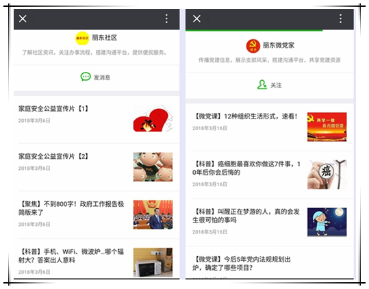 丽东社区主要以微信公众平台作为辖区科普知识宣传载体,从科普e站网站上转载相关内容到微信公众平台,提供居民群众阅读,通过不定期推送,让他们通过手机就可以轻松掌握了解生活常识,或者是科技前沿的各种新闻,极大地丰富了居民的知识面。目前社区有两个公众号,一个是丽东社区,一个是丽东微党家,还有一个企鹅号,通过一系列公众号平台将社区公告、社区概况、活动信息、社区内各项办事流程等服务性内容也纳入进来,不仅方便了居民办事和了解社区动态,也拓宽了科普宣传内容和范围。另外,通过微信公众号和企鹅号与科普电子阅览屏的无缝连接,居民在家点击手机微信公众号的科普信息版块,就能随时随地轻松浏览社区科普电子屏的所有内容。同时,招募科普志愿者,专门负责社区科普开展,发动民间组织和个人利用微信朋友圈等网络渠道进行科普知识的宣传、扩展。
