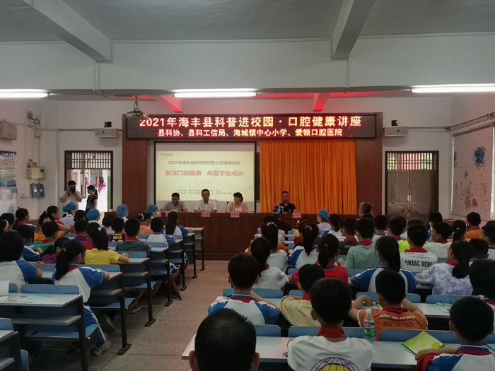 根据科技部、中央宣传部、中国科协《关于举办2021年全国科技活动周的通知》和广东省科协《关于开展2021年全省科技进步活动月系列活动的通知》,2021年5月26日,汕尾市海丰县科协、科工信局、海城镇中心小学、爱顿口腔医院联合在海城镇中心小学举办2021年海丰县科普进校园口腔健康讲座暨“学党史办实事”口腔健康义诊活动,共有120余名学生参加。