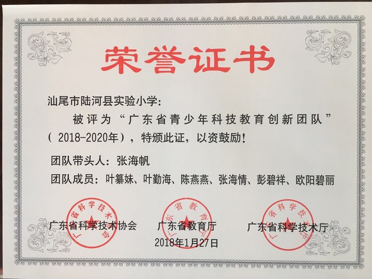 汕尾市陆河县实验小学参加第33届广东省青少年科技创新大赛获一等奖