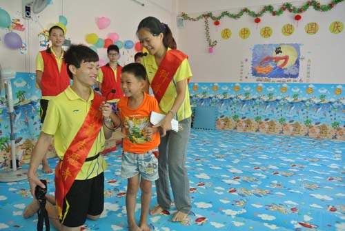 在残疾儿童康复中心,20多名青年志愿者和科普志愿者们还与这群特殊的小朋友们一起合唱了《感恩的心》,并开展了古诗背诵、爬行比赛、行走比赛以及两人三足等一系列丰富多彩、形式新颖的活动,让小朋友们享受到了节日的快乐,让家长们露出了久违的欢笑。小朋友们脸上洋溢出的童真和欢声笑语以及渐而矫健的步伐,充分体现了康复中心为小朋友们的康复作出的辛勤努力。