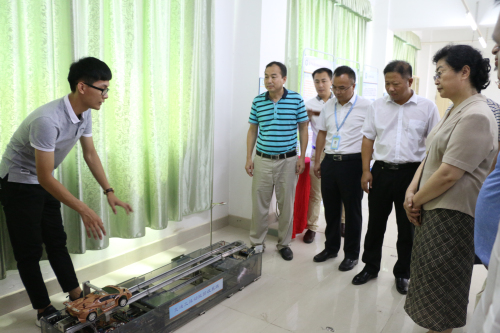 华附汕尾学校科技教师向汕尾市政协、汕尾市科协领导介绍今年在省青创赛获奖作品工作原理
