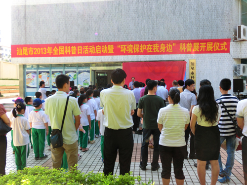 9月14日,由汕尾市科协、市教育局、市环保局主办的汕尾市2013年全国科普日活动启动暨“环境保护在我身边”科普展开展仪式在市科技馆门前广场举行。市科协专职副主席范志能、市环保局副局长黄宝真、市教育局教育科科长何文山、市全民科学素质工作领导小组办公室各成员单位相关负责同志,市实验中学和市实验小学师生代表共约100人参加了活动启动仪式。市科协秘书长徐雄主持仪式。