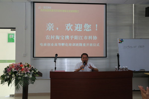 9月1日,阿里巴巴农村淘宝携手阳江市科协在阳江市农产品电商物流园举办全市电商创业高等孵化培训班。市科协主席郑辉印、副主席余中翠出席开班仪式,阳江市农产品电商物流园董事长、市农产品电商联合会会长李其介绍与阿里巴巴农村淘宝项目合作情况,并对培训作了动员。郑辉印代表主办方在开班仪式上致辞。管理学硕士、国家二级电子商务师、阿里巴巴电子商务区域总监钟纯及其团队、学员共60多人参加了开班活动。