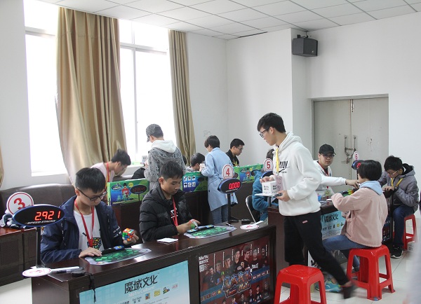 本次比赛项目包括二阶、三阶、四阶、单手、金字塔、斜转等比赛项目,每项比赛设立冠军、亚军和季军。比赛现场,比赛选手神情专注,手指翻飞旋转,争分夺秒地将杂乱无章的魔方复原,拼好后按下计时器。