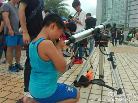 在早晨的阵雨过后,下午天气状况良好,参加活动的市民络绎不绝。作为天文科普活动的标志之一——天文望远镜,吸引了许多市民的目光。小朋友们对观星区的望远镜表现出极大的兴趣和热情。可惜到了傍晚,天色开始变暗,雨势加大,观星活动无奈取消。直至活动结束,仍有许多小朋友拉着志愿者的手,迟迟不愿离去。