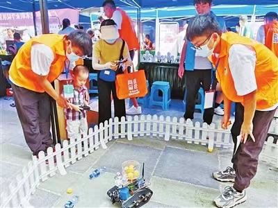科普志愿者指导小朋友现场操控机器人。珠江晚报记者吴长赋 摄