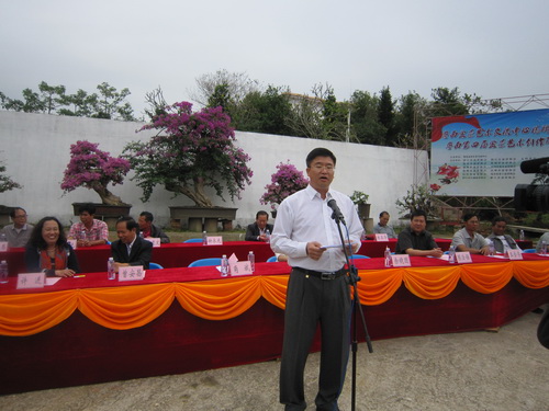 肖斌主席指出,中国盆景艺术源远流长,发展历史已逾千年,岭南盆景在国内、国际享有盛誉。粤西有丰富的制作盆景的乡土树种资源,有优越的自然气候条件,极适宜盆景树桩的生长,以及一大批从事盆景艺术工作者的努力下,粤西的盆景事业发展取得较显著的成绩。涌现了一批粤西对盆景艺术深有造诣的岭南盆景艺术大师及艺术家,盆景艺术爱好者越来越多,为粤西地区的盆景事业发展打下深厚的群众基础。 廉江盆景园是廉江科协在几年前就确认的科普示范基地。去年,在这里成功地举办了首届粤桂港(廉江)盆景艺术博览会,在行内产生了良好的效果。今天粤、桂、港的盆景艺术家及众多爱好者聚会于此,切磋技艺,进行艺术交流与研讨,共谋发展之良策,你们志趣相投,共同切磋,稍后的造型示范的表演,一刀一剪价值千金,充分体现出黄金有价、艺术无价的鬼斧神工之奇妙,今次活动极大地调动和激发广大爱好者的创作热情,影响深远。同时建立了中国岭南盆景雅石网粤西联络站,对今后充分利用互联网推动本中心机构实现跨时空、跨地域的技术交流与普及,将会产生深远的历史意义。我深信,在广东省盆景协会、《花木盆景》杂志社等媒体的关心指导下,在各级政府的支持下,有粤桂港各地兄弟协会的厚爱与支持,有在座各位大师的帮助和本中心各会员单位二千多名会员的共同努力,粤西盆景艺术交流中心在促进盆景产业的科学发展上必将走出康庄大道。