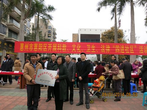 1月9日,由惠州市惠阳区人民政府主办,惠阳区科协、文明局和淡水街道科普协会承办,淡水松岭、桥东、白云、草洋、坝尾等社区协办的惠阳区2014年“科普之春”暨送科教、文化、卫生、法律“四进社区”活动在淡水松岭社区丽江花园广场举行。相关单位近100名科普志愿者和淡水街道干部群众、学生代表以及附近居民500多人参加了活动。惠阳区副区长朱文转出席活动并为松岭社区授牌。