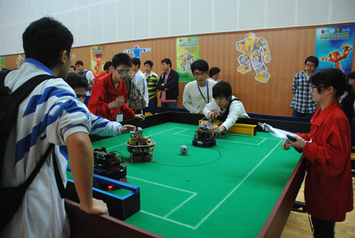 日前,周末的广州大学附属中学校园里依旧人声鼎沸,由广州市科协和中国自动化学会机器人竞赛工作委员会等单位主办,广州青少年科技馆和广州大学附属中学共同承办的2010RoboCup青少年世界杯中国赛区选拔赛正在这里举行。来自广东、北京、上海、江苏、浙江、辽宁及香港、澳门等地的近500名中小学生,带着他们“自编自装”的178支机器人足球队、机器人表演队现场激战,争夺该项国际赛事中国赛区的“出线权”,胜出者将代表中国赴新加坡参加今年6月举行的国际总决赛。