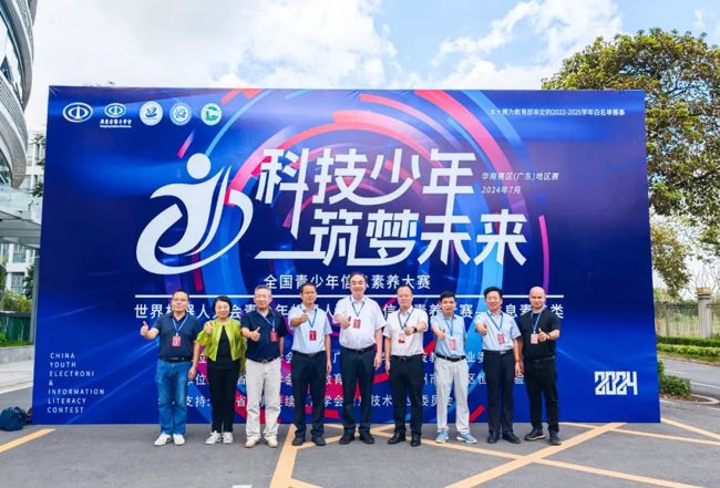 省科协科普部副部长黄雄飞,省电子学会常务副理事长兼秘书长彭志聪,广东教育学会科技教育专委会理事长胡继飞教授,番禺区教育局党组成员、副局长曾伟杰,省电子学会副秘书长、中学生报社副社长吴中辉,广州工程技术职业学院副教授、博士、大赛总仲裁长罗隆,番禺区教育局中小教科科技专干冯伟文及广州市番禺区恒润实验学校校长张银华出席大赛开幕式。
