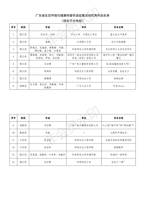 广东省生态环境与健康科普作品征集活动6月份启动以来,得到了省内外关注环境保护、环境健康,热衷科普创作的个人、团体和企事业单位的积极响应。共收到科普作品52项,其中图文类25项、视频类5项、歌曲类1项、文学作品类14项、推文类7项。经二轮评审,最终评选出优秀作品14项,其中图文类7项,视频类2项,歌曲类1项,文学作品类2项、推文类2项。
