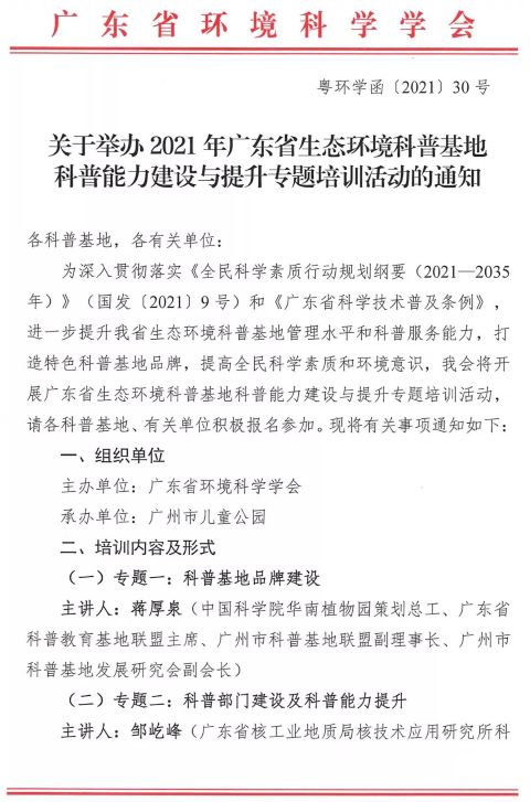 广东省环境科学学会关于举办2021年广东省生态环境科普基地科普能力建设与提升专题培训活动的通知