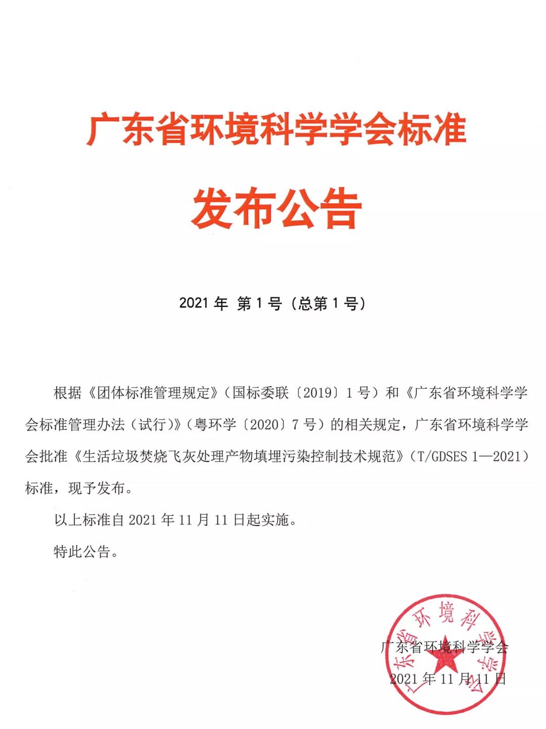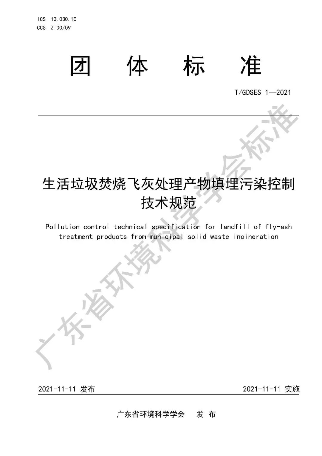 省环境科学学会1号团体标准《生活垃圾焚烧飞灰处理产物填埋污染控制技术规范》正式发布