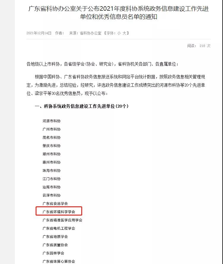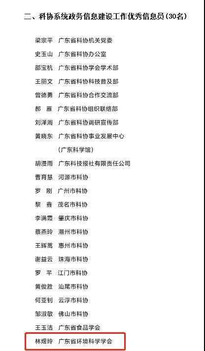 日前,广东省科协办公室发布《关于公布2021年度科协系统政务信息建设工作先进单位和优秀信息员名单的通知》,对科协系统政务信息建设工作成绩突出的先进单位和优秀信息员予以表彰。省环境科学学会获评“2021年度科协系统政务信息建设工作先进单位”称号。这也是省环境科学学会暨2020年后第二次获此殊荣,省环境科学学会综合部林煜玲同志获评“2021年度科协系统政务信息建设工作优秀信息员”。